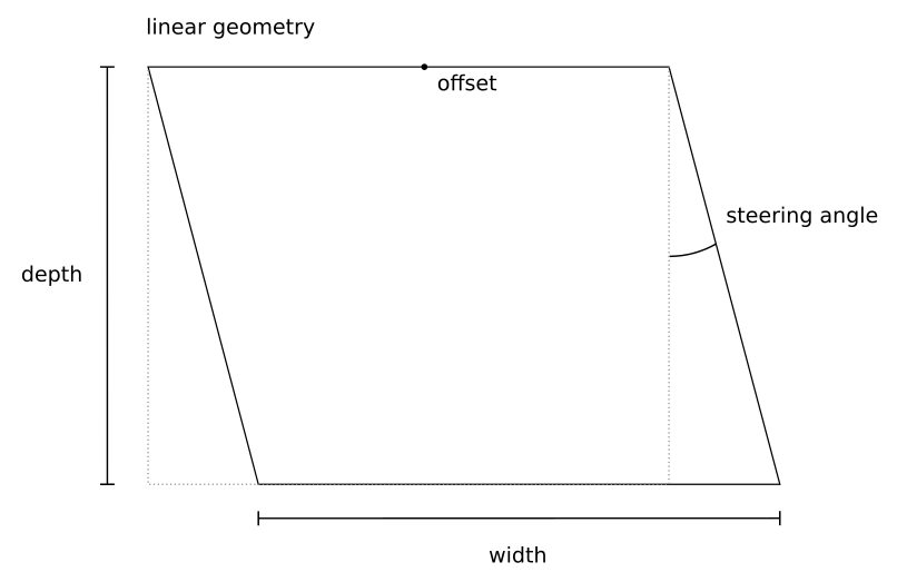 Width and depth define the size of the ultrasound frame relative to the offset location. The offset is in the top or bottom center of the frame, depending on the topDown setting, i.e. at the center of the transducer array. For a classic linear frame without steering, the offset is at (width/2, 0) in pixels, and at (0, -height/2) in image coordinates.