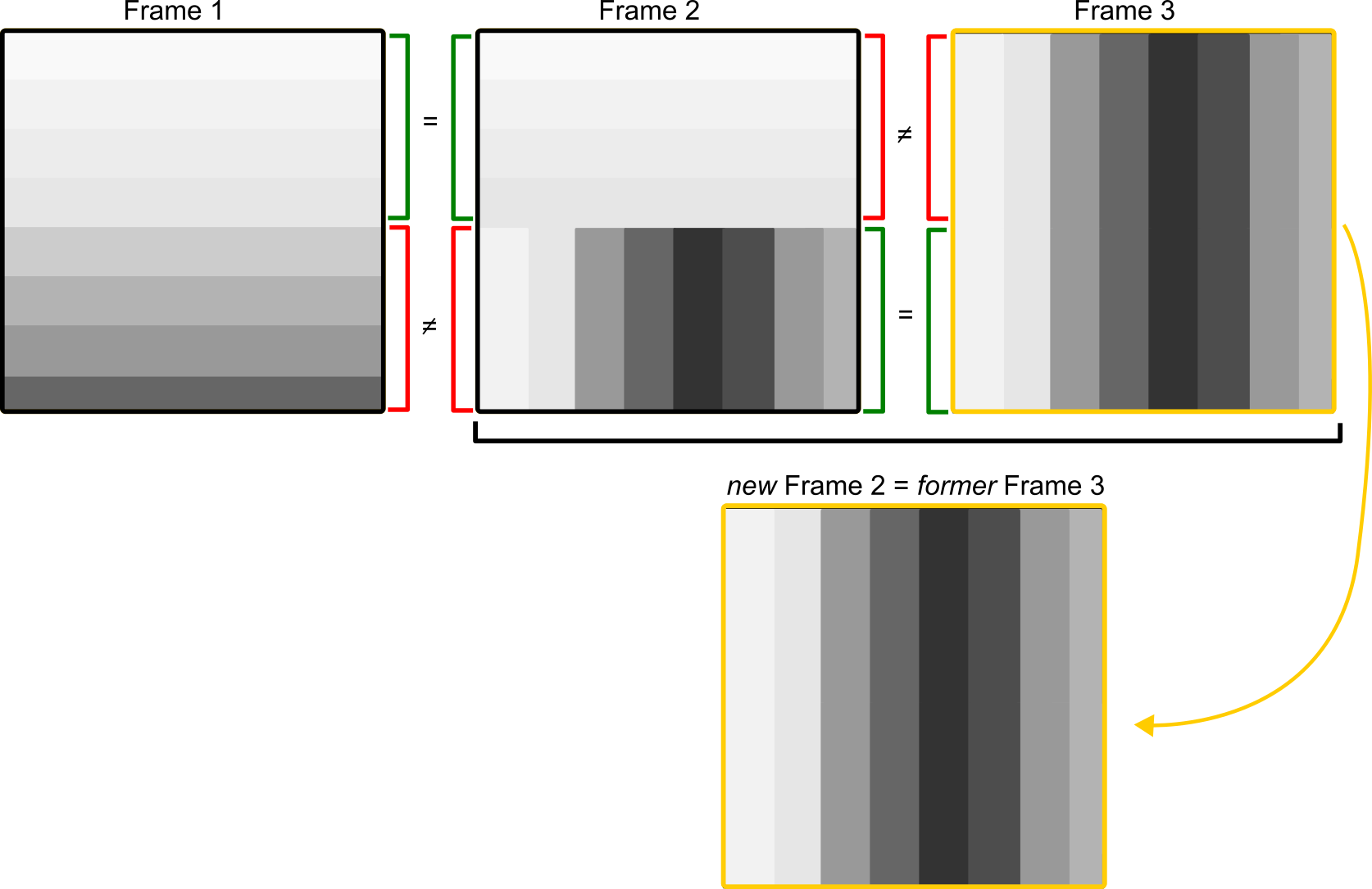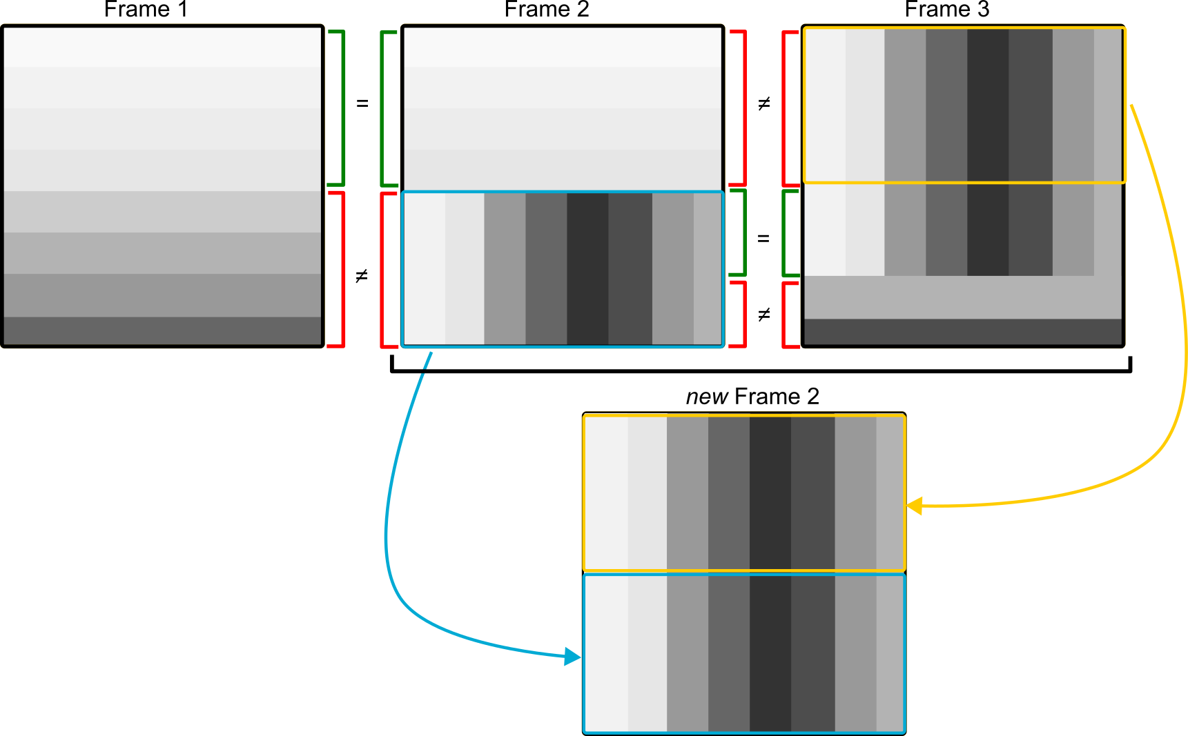 This algorithm is designed to clean up ultrasound or video sequences by identifying and removing frames that are either exact duplicates or nearly identical to their immediate predecessor. This reduces data size, improves processing efficiency, and can help mitigate artifacts in downstream processing. The algorithm compares each frame to the previous one using configurable pixel-wise difference thresholds. The algorithm does not create new data, but modifies the input. If p_repairHorizontalTearing is true, the algorithm attempts to repair horizontal tearing artifacts by merging frames at detected cutlines (see illustration below). Otherwise, the algorithm detects screen tearing and removes frames that contain the tear (see illustration below).