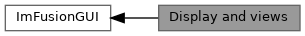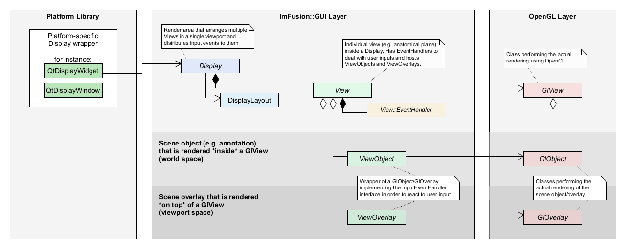 The top-most entity is represented by the DisplayBase interface providing a viewport into which one or multiple View objects can render. The views can be arranged inside the viewport using a tiling layouting approach with the DisplayLayout class. For instance, a typical radiology workstation setup for volumetric data would show 3 MPR views (axial, sagittal, coronal) as well as a 3D volumetric view in a 2x2 grid. The DisplayBase is also the one to receive InputEvents from the platform GUI toolkit and will distribute them to the entities inside (e.g. views).