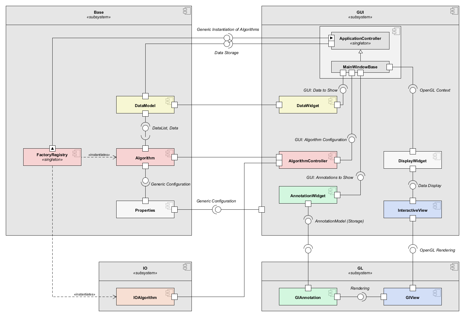 The framework architecture is designed according to the model-view-controller pattern. The model is represented by the DataModel class which manages all image data and is described in detail in Data Model. The view is represented by the DisplayWidgetMulti class and is described in detail in Visualization and Views. Finally the controller is represented by the ApplicationController and the MainWindowBase classes which provide access to the GUI components and link the data with the view. In addition the view manages the so called algorithms which are one of the central concepts of the framework. They are used to perform the actual image processing as well as data I/O and can be dynamically loaded at run-time using a plugin concept (see Algorithms and Plugin Architecture). The framework consistently makes use of the GPU to enable high-performance computing. This GPU functionality is also available to users (see GpuSupport). To allow for saving the working state and for configuring objects without needing to know their implementation a generic property system is used (see Object Serialization).