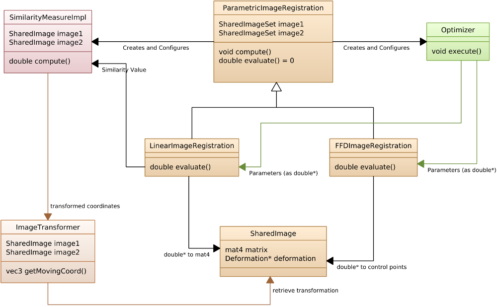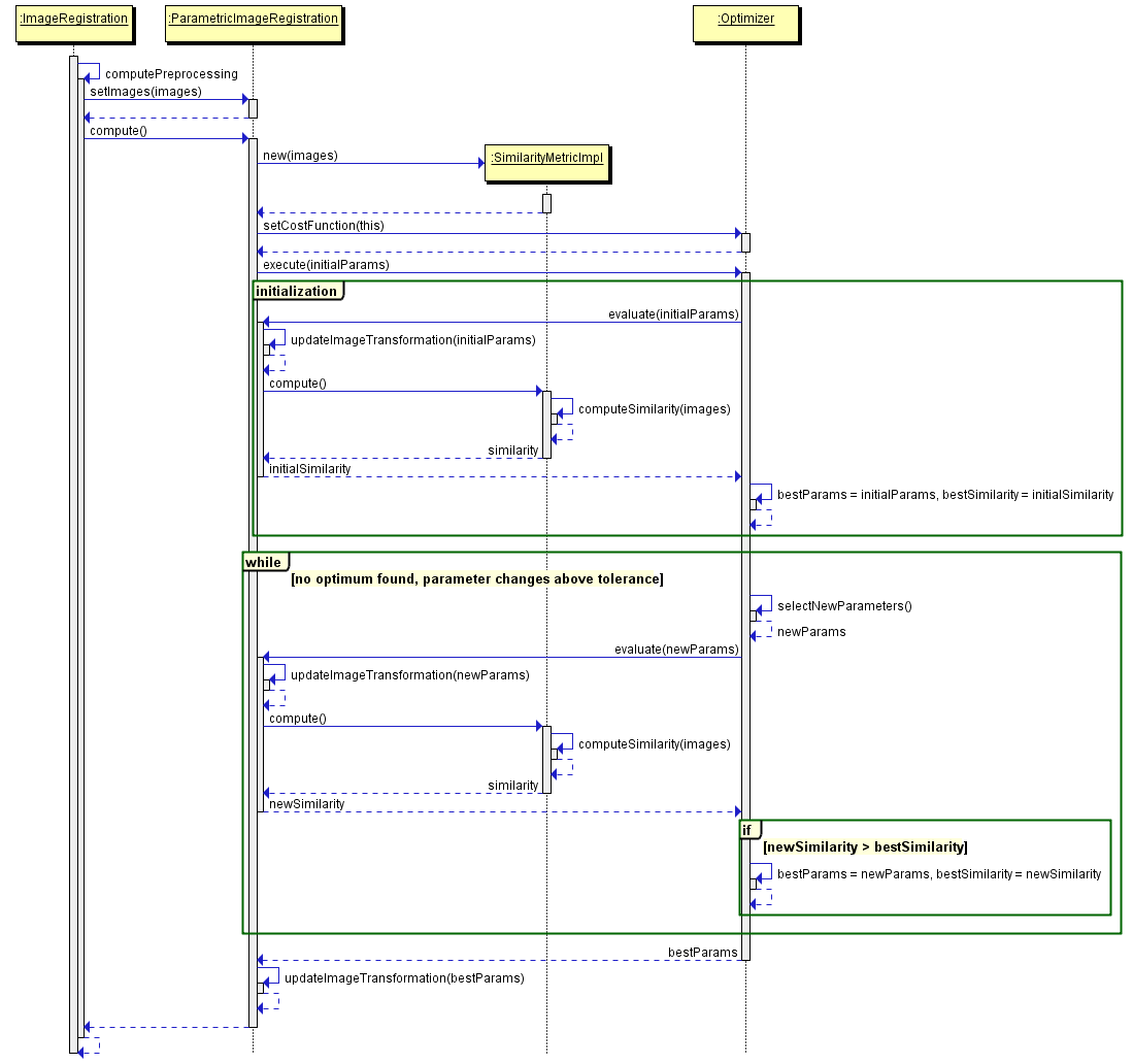 When compute is called the ParametricImageRegistration base class will instance the SimilarityMeasureImpl and the Optimizer. Subsequently it will execute the optimizer. The number of parameters is determined by the dimension of the optimizer.