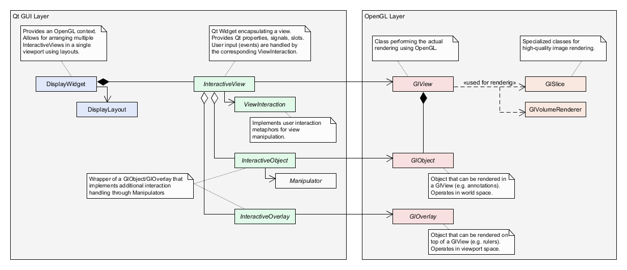 The top-most class in the visualization framework is DisplayWidgetMulti, which represents a display surface on which OpenGL can render. Among other things it provides methods for adding and removing views and managing the layout through an associated DisplayLayout object. A single view is represented by InteractiveView which is a high-level Qt-aware class. As such it can display context menus and deal with user input such as mouse events. Inside the interactive view is an associated GlView object which is responsible for setting up the OpenGL scene and rendering Data. Furthermore, a GlView renders GlObject instances, such GlAnnotations. User interaction is handled on the Qt GUI layer side by objects inheriting from Interaction. They can be attached to an InteractiveView and translate user input to calls on the underlying GlView. Several pre-defined Interaction objects exist allowing to quickly add support for standard 2D- and 3D interactions such as pan, zoom and rotate.