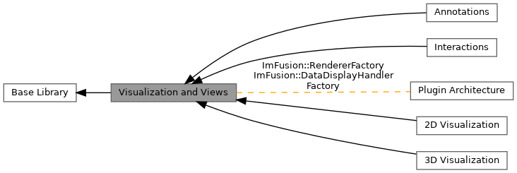 Collaboration diagram for Visualization and Views:The ImFusion library natively supports the 2D and 3D visualization of any number of images and geometric objects (e.g. meshes). Data is visualized inside a display containing one or multiple views. The size and location of the views is managed by a layout manager. This allows to easily add and remove views and to create side-by-side layouts for simultaneously working with multiple data sets without having to directly deal with layout issues. The actual rendering of the data is performed by OpenGL objects which are rendered by the views. Views are not limited to rendering only a single object but can also render multiple objects for instance allowing to blend multiple data sets in a registration scenario. To remain independent of the GUI-toolkit used to build the application, the visualization framework is consistently separated into a high-level GUI-dependent layer and a low-level OpenGL-based layer.