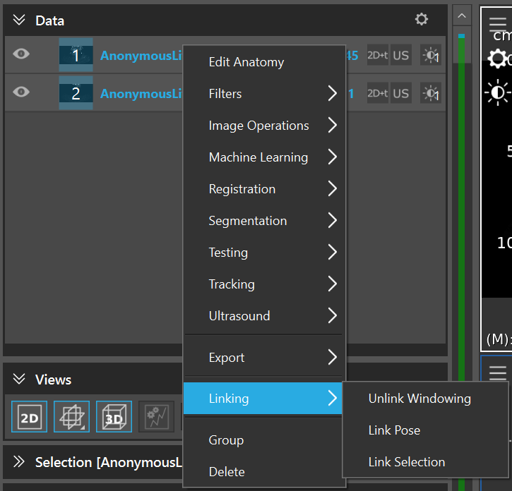 The ImFusion Suite enables you to link certain properties between multiple datasets. Dataset links are created by selecting multiple datasets in the Data Widget, opening the context menu by clicking the right mouse button, and navigating to the Linking submenu. Depending on the selected datasets and their current linking state you can create new links or unlink datasets.