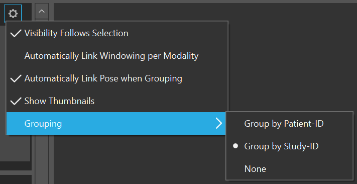 Grouping: Enables you to automatically group your datasets by patient ID or study ID if your datasets contain the necessary metadata (e.g. if they originate from DICOM). By default, all datasets are shown in a flat list unless you create manual groups.