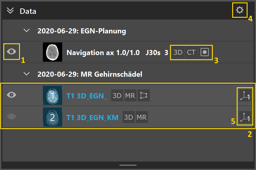 The main functionality of the Data Widget is to toggle visibility of datasets, and to select them in order to run algorithms on them (cf. Running Algorithms on Data). Visibility is indicated by the eye icon (1), while selection is indicated by highlighting the row and using a blue font color (2). Number overlays over the icon/thumbnail indicate the selection order in case more than 1 dataset is selected.