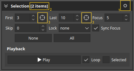 First: Controls the first element in the selection. The use current focus buttons (3) can be used to set it to the current focus.Last: Controls the last element in the selection. The use current focus buttons (3) can be used to set it to the current focus.Focus: Controls the focused element.Skip: Controls the number of skipped elements. E.g. a skip of 1 means that every second element is selected.Lock: Allows you to lock either the first or the last or both elements of the selection to the focus. E.g. when the first element is locked, the first element will follow as the focus changes.Sync Focus: When more than one dataset is targeted, this checkbox allows you to synchronize the focus between all targeted datasets.
